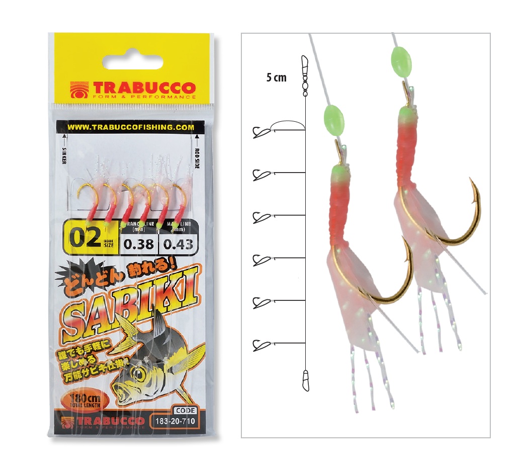 Сабіки – найкращий спосіб ловити рибу на готову оснастку. Нова модель Sabiki від Trabucco – це оснастка для лову з човна дрібних та середніх пелагічних хижаків, таких як скумбрія, луфарь та ставрида. Хімічно заточені карбонові гачки оснащені рожевими спідницями, схожими на креветок, та дрібними кристалічними нитками, закріпленими у формі «ластівчин хвіст», з шаром фосфоресцентної фарби, що герметизує та закріплює вузол. Ми рекомендуємо використовувати наші Sabiki з вантажем, пропорційним течії. Занадто важкий вантаж ризикує зловити менше риби, ніж трохи легший, який здатний змусити Sabiki плавати за течією. Порівняно з аналогічною моделлю цієї компанії, вони трохи змінили відтінок рожевого кольору креветок.